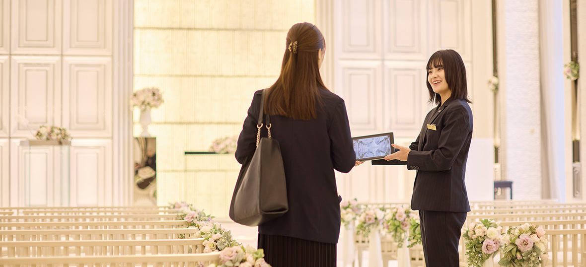 鈴木 ブライダルフェアにお越しいただいた結婚式を挙げる予定の新郎新婦様に、ご希望などをヒアリングしながら会場をご案内し、式場や結婚式の魅力を伝える新規プランナーというお仕事を担当しています。ラグナヴェールTOKYOでは、新規プランナーのほかに、新規チームから引き継ぎを行い当日まで担当していくプランナーと、当日新郎新婦様に付き添うサービスのチームで構成されています。