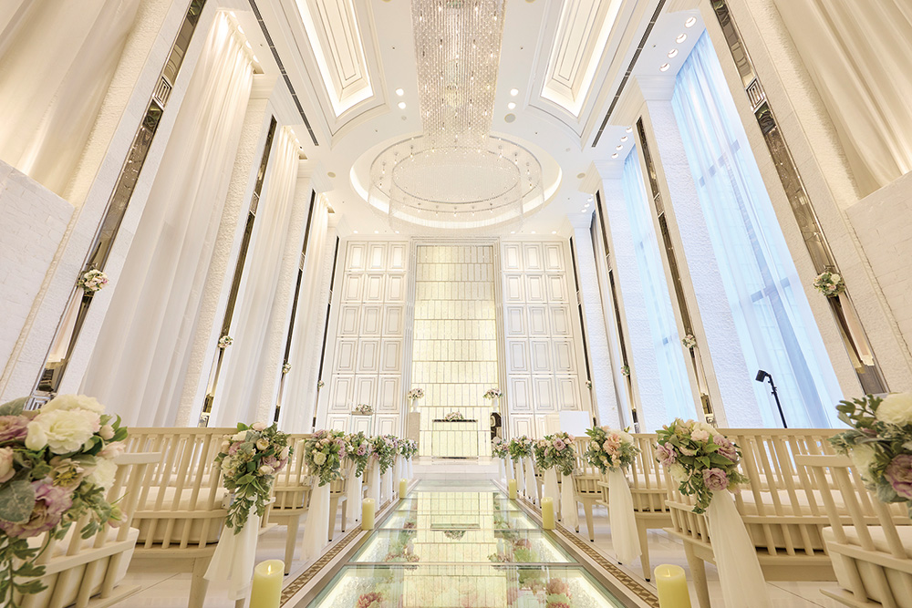 鈴木 ラグナヴェールTOKYOの魅力は二つあります。一つ目は、東京駅から徒歩5分の場所にある、唯一の貸し切り会場である点です。車やバスを使わずに訪問できるため、ゲストにも優しい立地です。二つ目は、天井高7mの「クリスタルチャペル」です。自然光が差し込み、シャンデリアが輝く開放的な空間で、多くの新婦様が憧れる美しさが広がっています。
