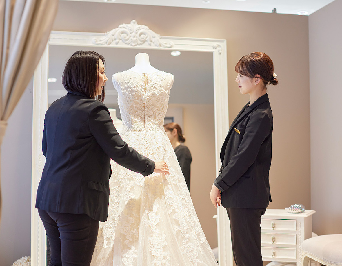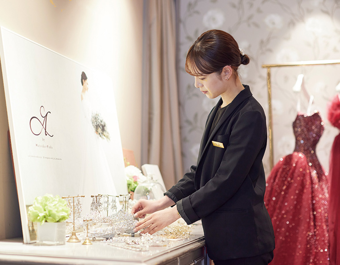 お客様をお迎えし、お部屋やドレス・小物の準備を行います。フィッティング後はお片付けに入り、ドレススタイリストの方のアシスタント業務をさせていただくこともあります。