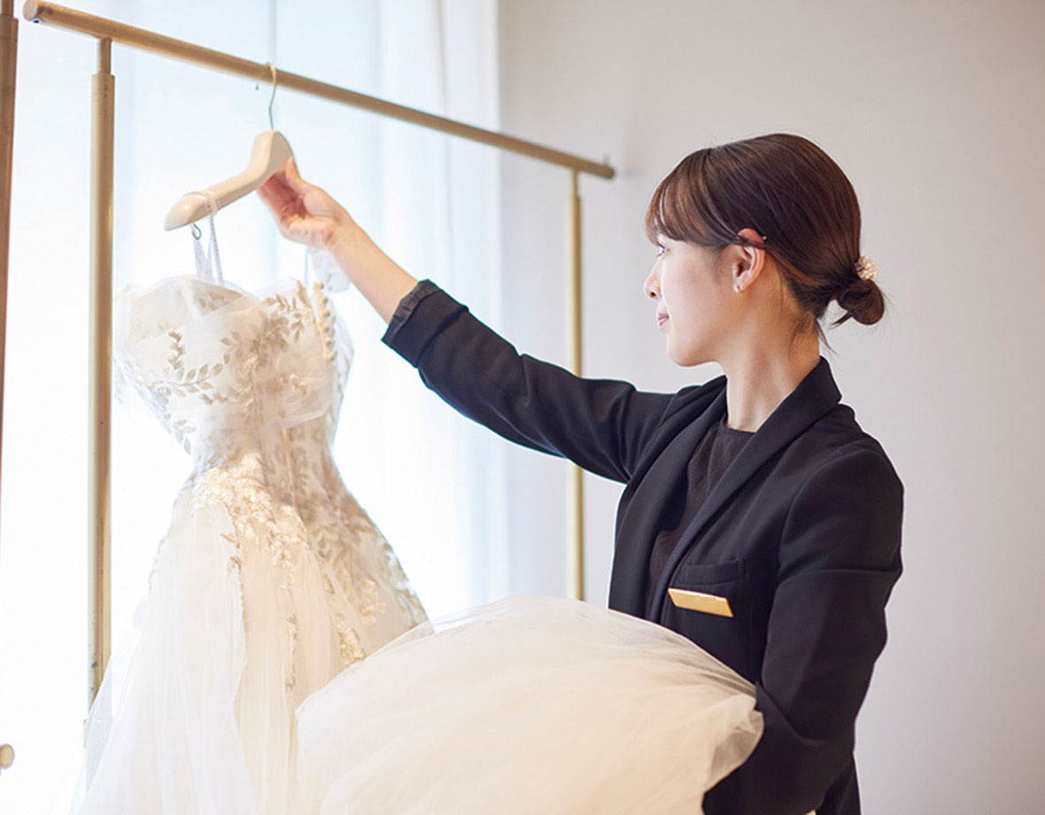 お客様をお迎えし、お部屋やドレス・小物の準備を行います。フィッティング後はお片付けに入り、ドレススタイリストの方のアシスタント業務をさせていただくこともあります。