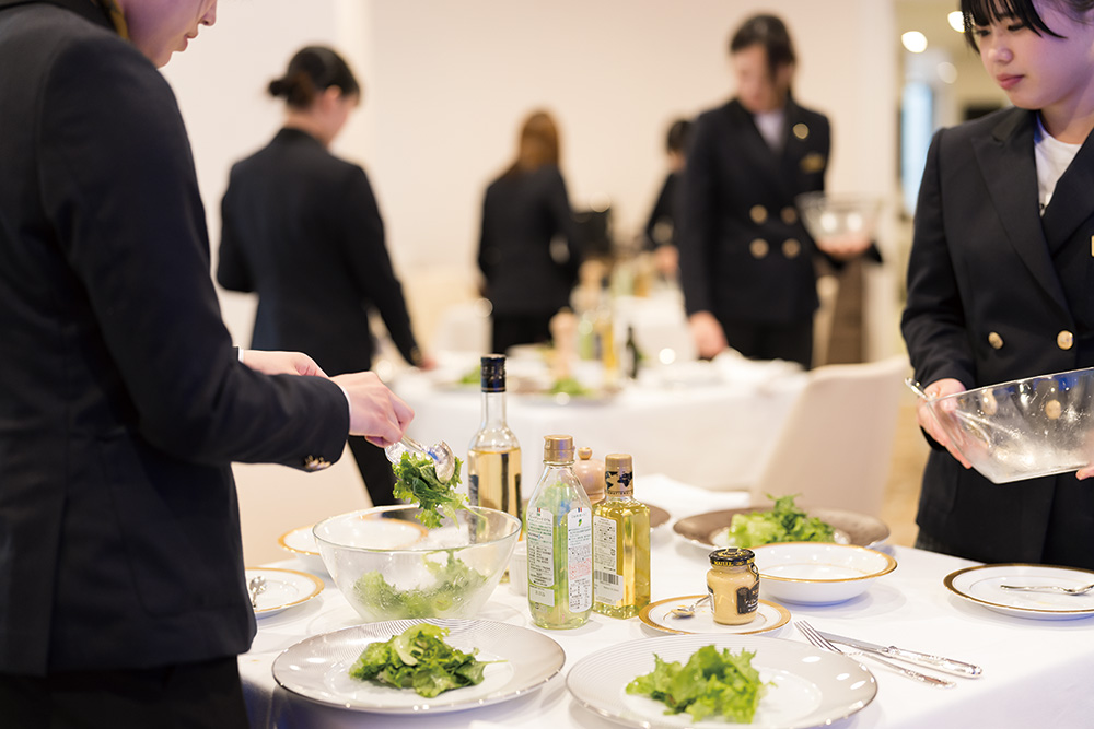 準備、実習、片づけまでの流れを体験し、調理とホールのつながりを理解することで、一流の仕事を知る。