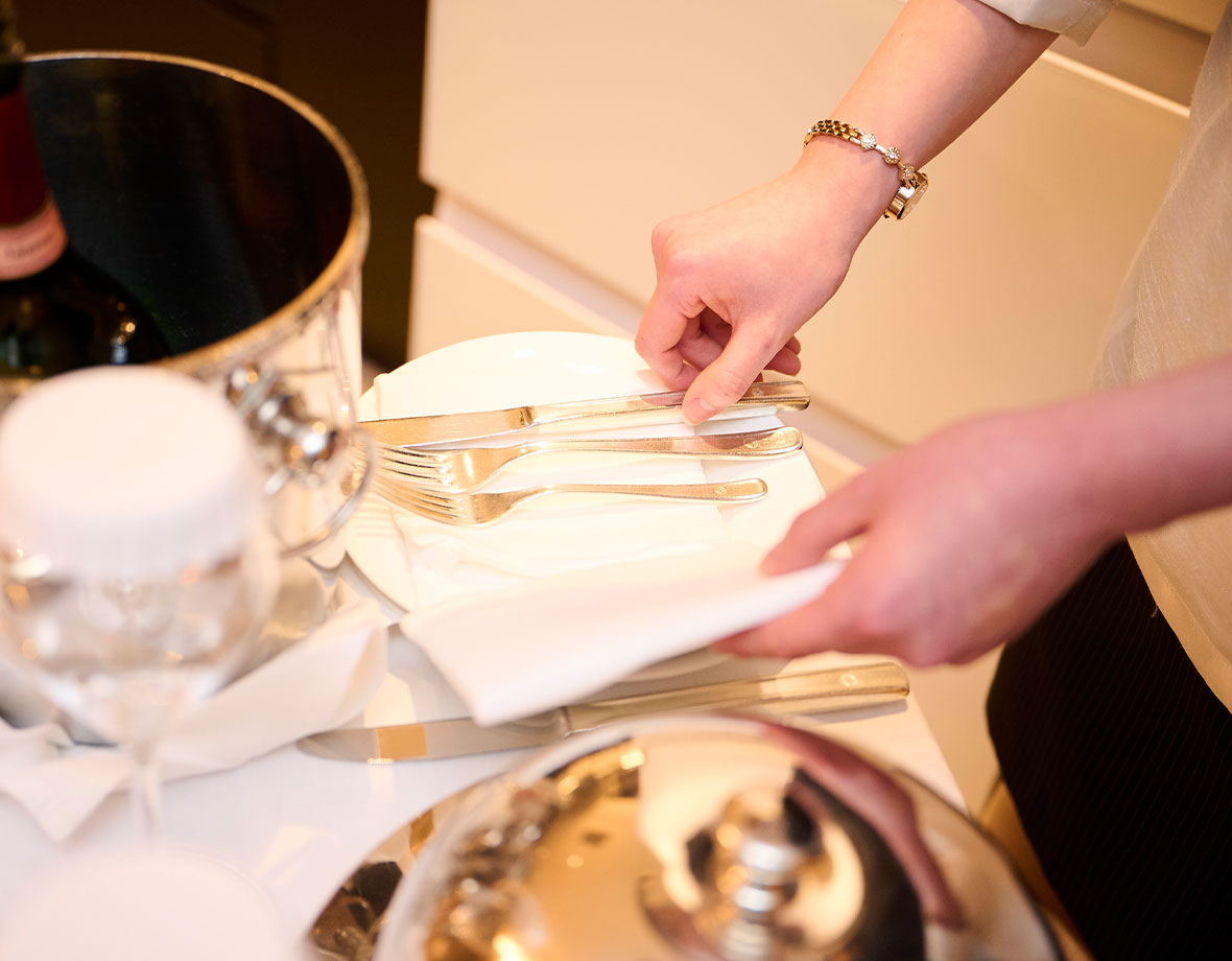 このお食事にはこのカトラリーが必要、というセットを全て覚え、セットして客室へ運びます。おふたり宿泊されているけれど、注文されたお料理が1名分だったというような場合、シェアされるかもしれませんから、カトラリーを2名分お持ちしよう、などお料理だけではなくて、お部屋の宿泊人数も考えて動くようにしています。