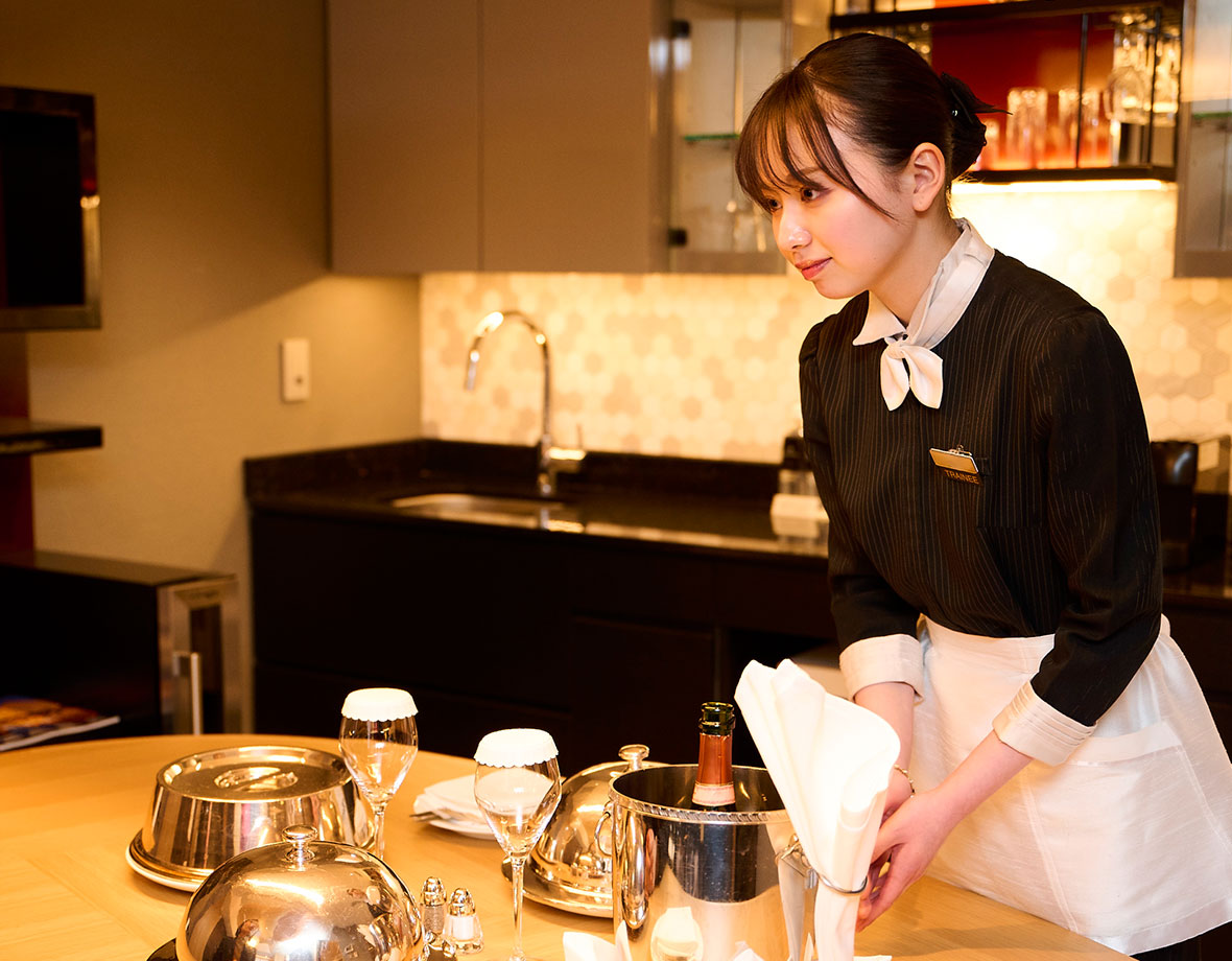 お客様の口に入るものをご用意いたしますので、カトラリーに汚れがないか、先輩方はとても丁寧に見て、セッティングしていて、これこそがプロの仕事なのだと感じました。実際にお客様にサービスをさせていただくなかで、私はうまく会話ができず悔しい思いもしましたが、知識とボキャブラリーを増やしていけたらと今は思っています。お部屋でお料理をご提供する際に、お客様の嬉しそうな表情を拝見できることが、なによりの仕事の喜びでした。