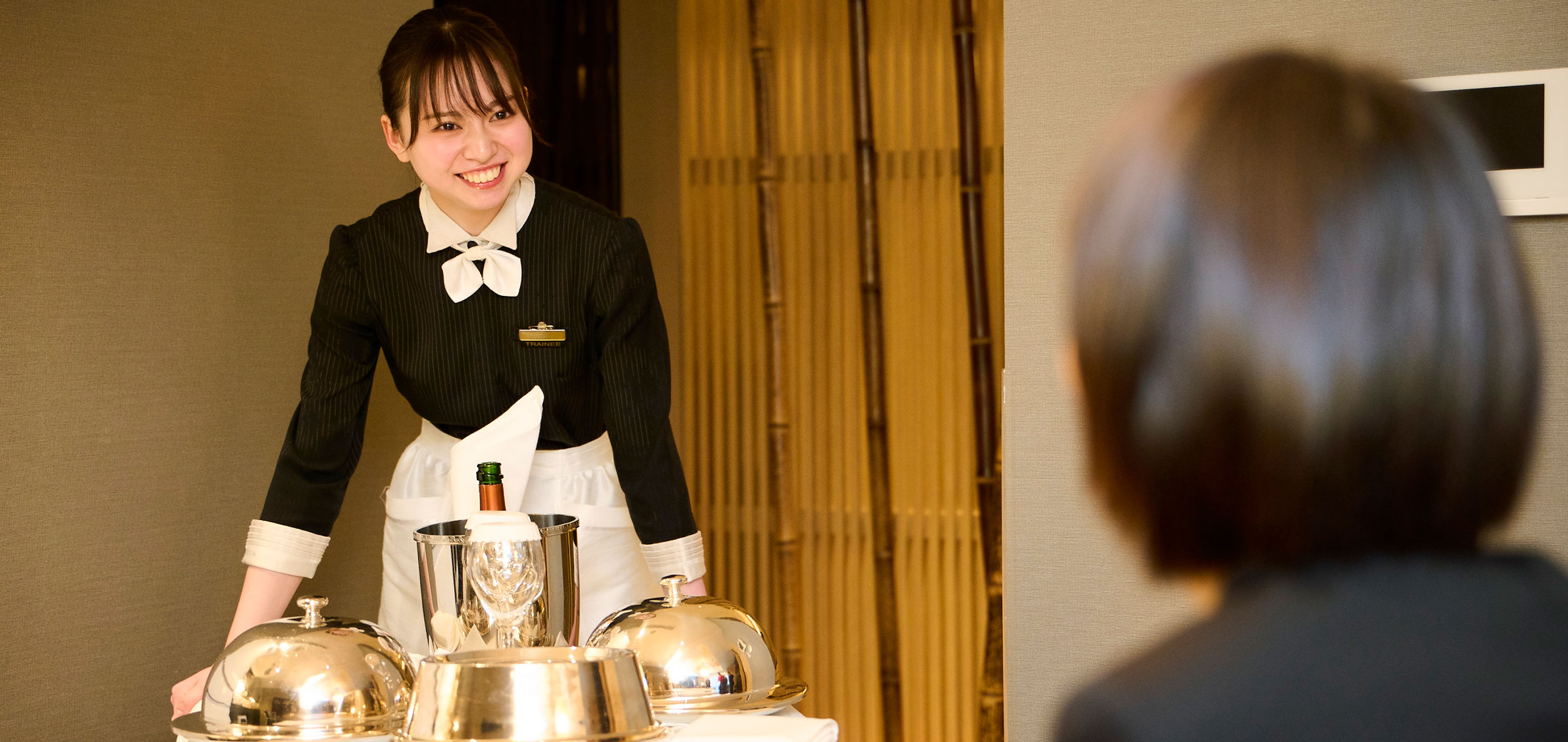 部署にもよりますが、研修を経てそれぞれ現場で先輩たちの指導のもとスキルを向上させていきます。また希望があれば語学や、ワインの検定試験のための学習など専門的な勉強もサポートしています。社内ではカクテルコンペティションも行われ、料飲の部署でなくても、若手もベテランスタッフも一緒に腕を競っているんですよ。私たち人事などのバックオフィスの者も全員それぞれにフロントやレストランなどのサービスも経験しており、現在でも私は時に宴会場でサービスを行うこともあります。私たちは、全社員が最終的にはサービスのプロフェッショナルになれるのです。